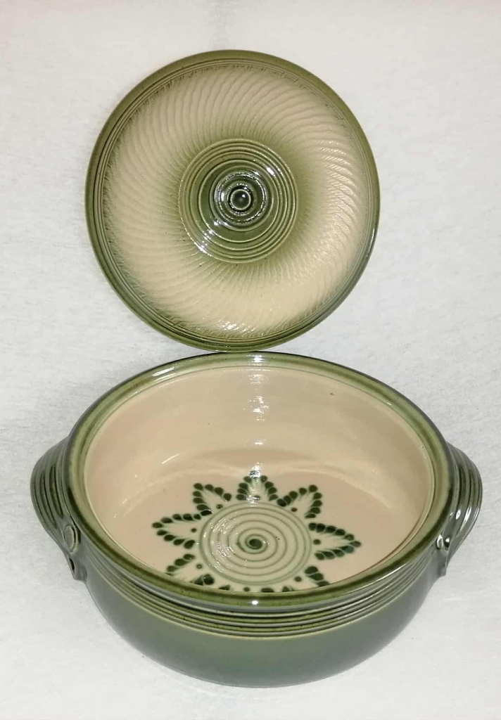 A lapos fedeles sütőtálban nagyszerűen elkészíthetőek bármilyen húsok,rakott ételek,Egyedi mintája ,és színe miatt nagyon szépen mutat a teritett asztalon.Cserépedény sajátossága, hogy a benne lévő ételt nagyon sokáig melegen tartja.Ez a samottos agyagból készült edény kiválóan alkalmas  a villany,gáz sütőben való használatra egyaránt.