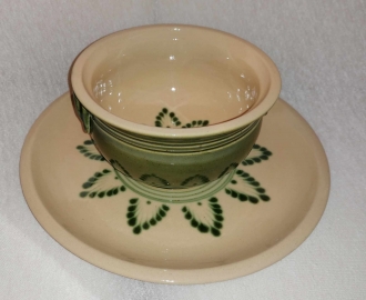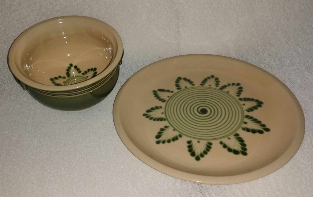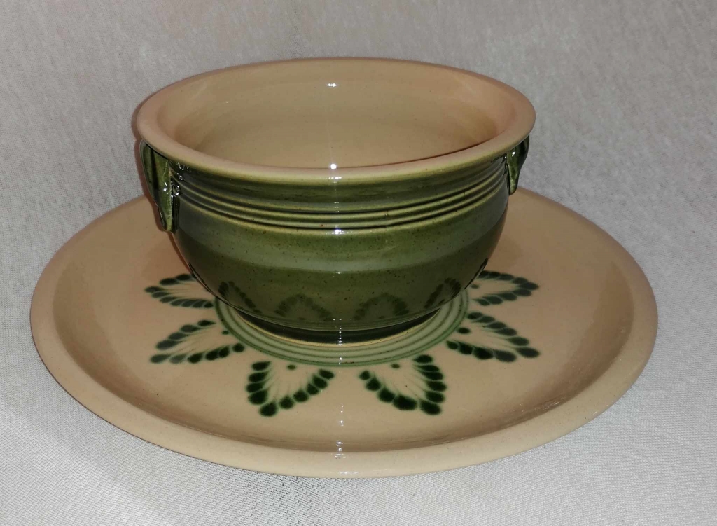 Evőtányér praktikus fülekkel. Kerti bográcsozáskor is célszerű használni, mivel a tányér jó mély,és a fülek segítségével könnyű a teli tányérat megfogni.Kézhez álló alakjának köszönhetően nem csak a szépen terített asztalnál ,hanem a tábortűz mellett is mindenféle kilötyögések nélkül kanalazhatjuk pl. a gulyást ,vagy a csülkös babot illetve a halászlét.Használható kináló és kocsonyás tálként is.Akár süthetünk is benne kisebb adagokat a sütőben.(hőálló edény)