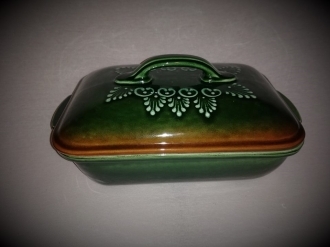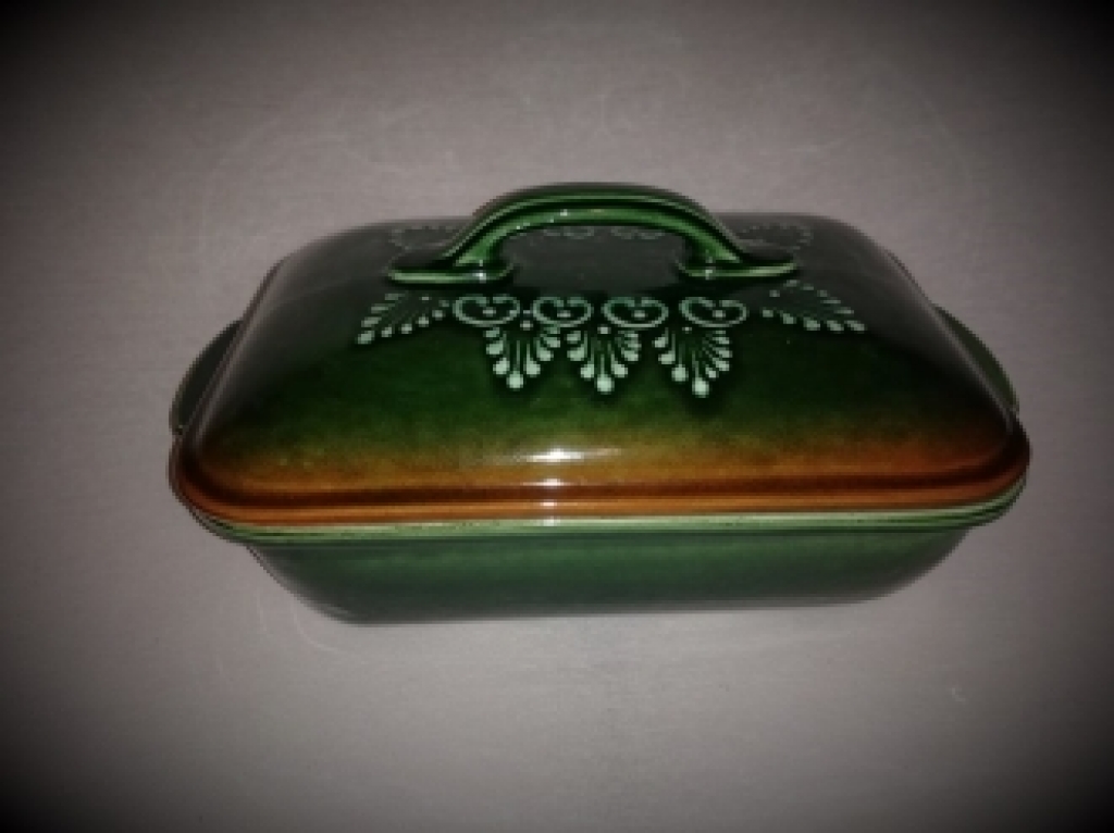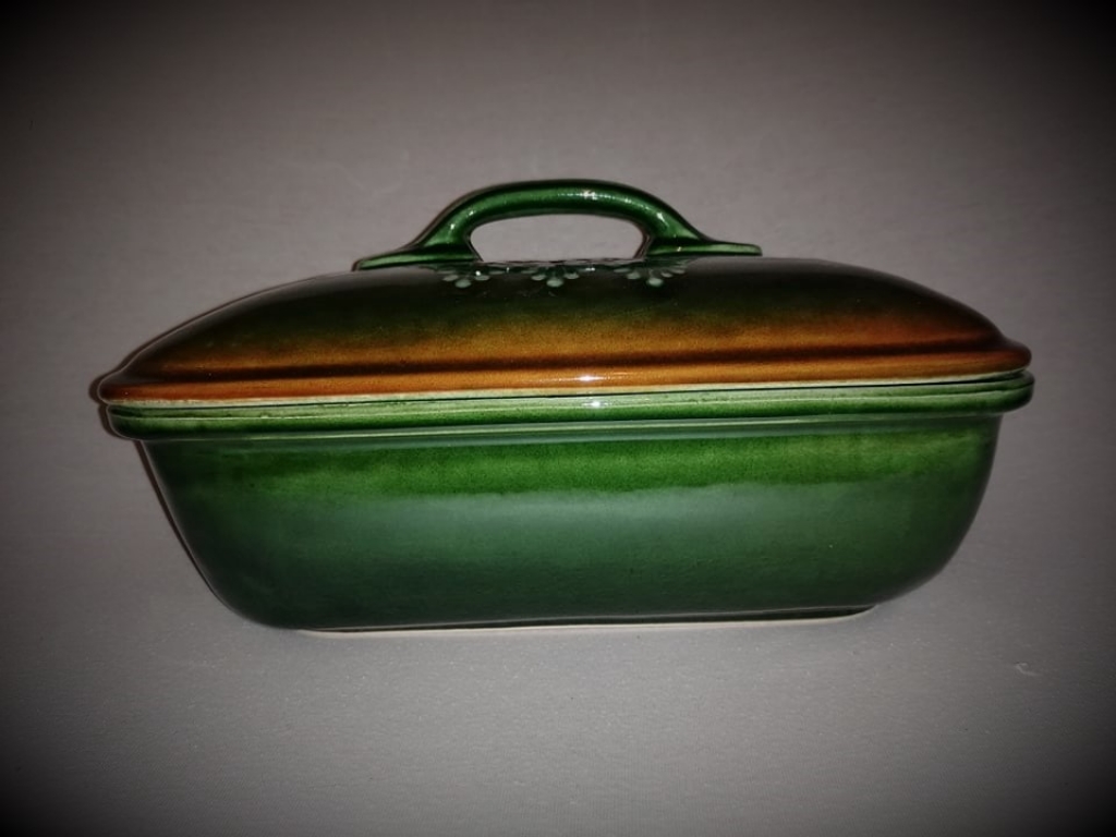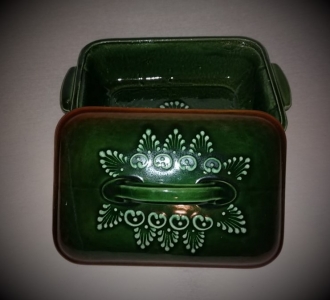 Szögletes fedeles tepsi, húsoknak, rakott ételeknek,egészben sült kacsának,csirkének, is kiválóan alkalmas.Egyedi mintája ,és színe miatt nagyon szépen mutat a teritett asztalon.Cserépedény sajátossága, hogy a benne lévő ételt nagyon sokáig melegen tartja.