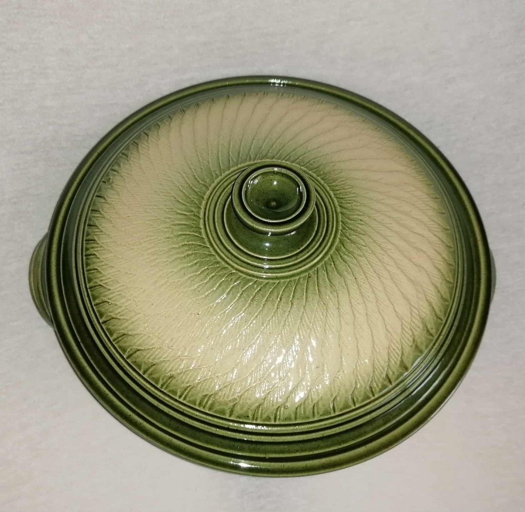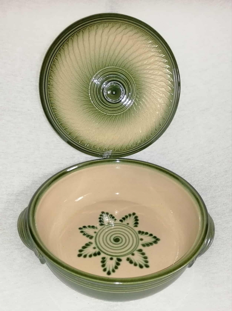 A lapos fedeles sütőtálban nagyszerűen elkészíthetőek bármilyen húsok,rakott ételek,Egyedi mintája ,és színe miatt nagyon szépen mutat a teritett asztalon.Cserépedény sajátossága, hogy a benne lévő ételt nagyon sokáig melegen tartja.Ez a samottos agyagból készült edény kiválóan alkalmas a villany,gáz sütőben való használatra egyaránt.